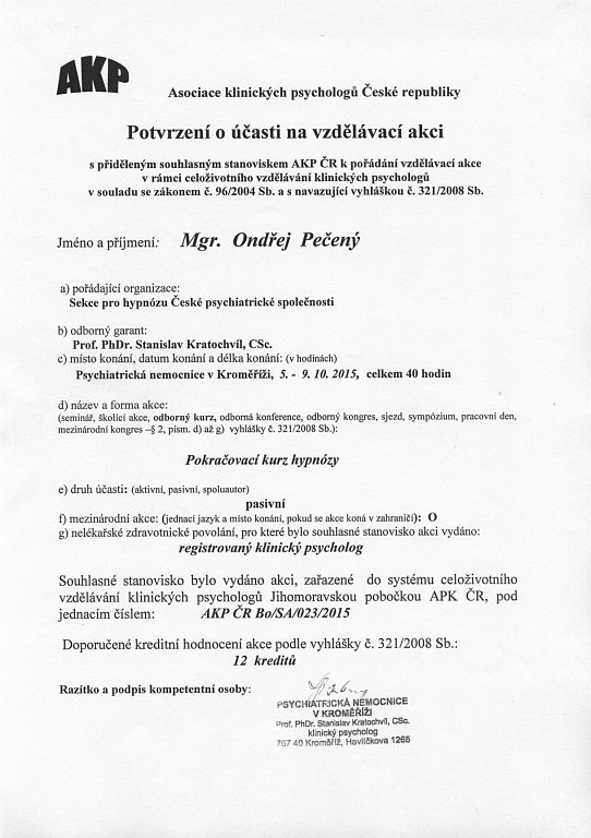 V roce 2015 jsem prošel pokračovacím výcvikem v klinické hypnóze pod vedením Prof. Kratochvíla