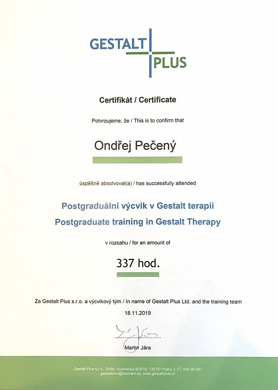 / Certifikát o absolvování tříletého postgraduálního výcviku v gestalt terapii v Gestalt plus s.r.o.